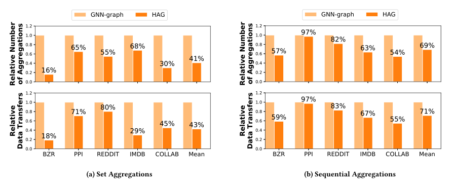 Set Aggregate: 大部分GNN都会假设节点的邻居是无序的,并且聚合是关联和交换的操作,这些操作和聚合的执行顺序是没有关系的。在表一的示例中有表示summation aggregation的GCN和element-wise aggregation的GraphSAGE-P。注意,GNN中的set aggregation的过程顺序是不会发生变化的,因此是可以按照HAG对其进行分层聚合。