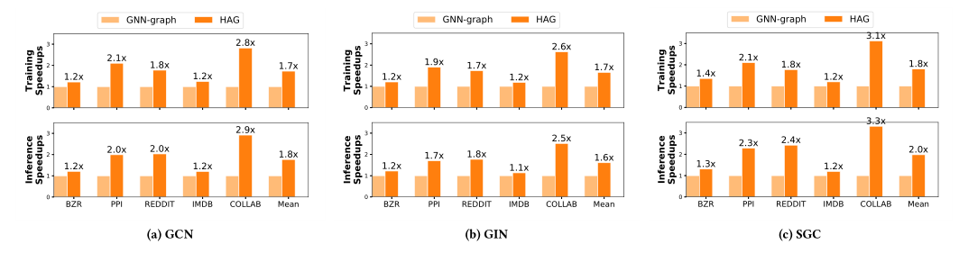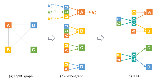 同时,该文证明了使用HAG进行中间聚合的GNN和原始GNN会有完全相同的输出和梯度。当GNN模型在每层的输出相同的激活表示 且在GNN进行反向传播的过程当中所有的训练参数都保证了相同的计算梯度,那么与原始GNN和GNN with HAG二者就是等价的。