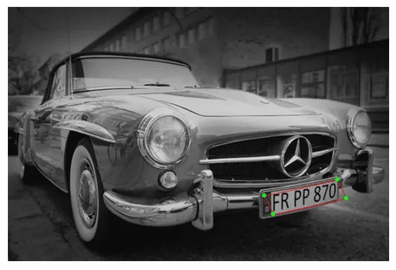 此外,DBNet的官方代码里提供了转换到onnx模型文件,于是我依然编写了一套使用opencv部署DBNet文字检测的程序,依然是包含C++和Python两个版本的代码。官方代码的模型是在ICDAR场景文本检测数据集上训练的,考虑到车牌里也含有文字,我把文章开头展示的汽车图片作为输入,程序检测结果如下,可以看到依然能检测到车牌的4个角点,只是不够准确。如果想要获得准确的角点定位,可以在车牌数据集上训练DBNet。