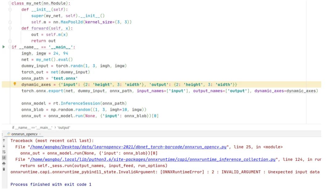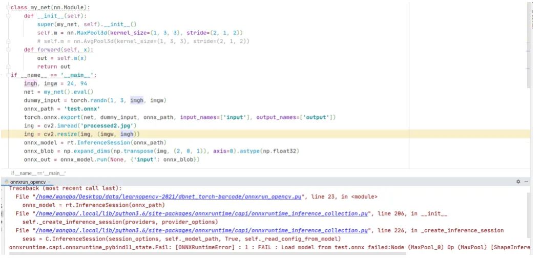 可以看到,在生成onnx文件后,使用onnxruntime库读取,对输入blob的高增加10个像素单位,在run这一步出错了。使用opencv读取onnx文件,代码和运行结果的截图如下,可以看到依然出错了。