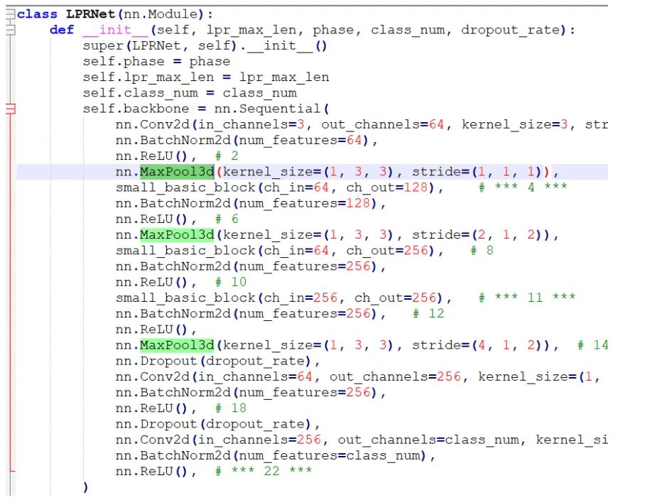 从打印结果看,torch.onnx.export生成onnx文件时没有问题的,但是在cv2.dnn.readNet这一步出现异常导致程序中断,并且打印出的异常信息是一连串的数字,去百度搜索也么找到解决办法。观察LPRNet的网络结构,发现在LPRNet里定义了3维池化层,代码截图如下