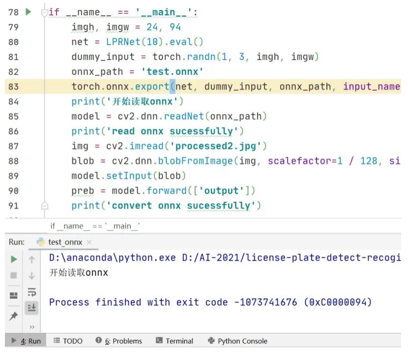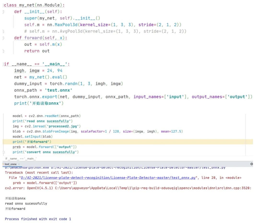 接下来我就尝试把pytorch模型转换到onnx文件,然后使用opencv做车牌检测与识别。然而在转换完成onnx文件后,使用opencv读取onnx文件遇到了一些坑,我在网上搜索,也没有找到解决办法。