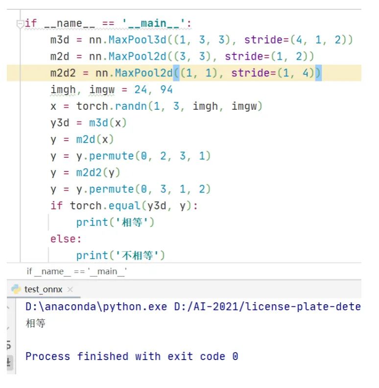 程序最后最后运行结果打印信息是相等。从这里就可以看出opencv里的深度学习模块并不支持3维池化的前向计算,这期待后续新版本的opencv里能添加3维池化的计算。这时在LPRNet网络结构定义文件里修改3维池化层,重新生成onnx文件,opencv读取onnx文件执行前向计算后依然出错,运行结果如下。