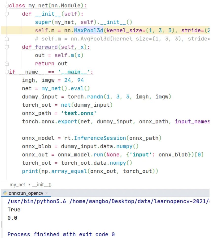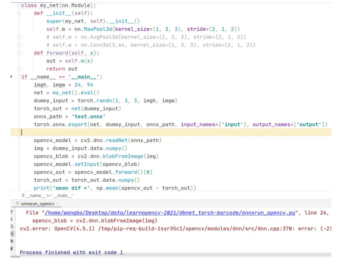 在修改这个代码bug后重新生成onnx文件,使用opencv读取onnx文件做前向计算就不再出现异常错误了。