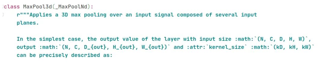 查看nn.MaxPool3d的说明文档,截图如下,可以看到它的输入和输出是5维张量,于是修改上面的代码,把输入调整到5维张量。