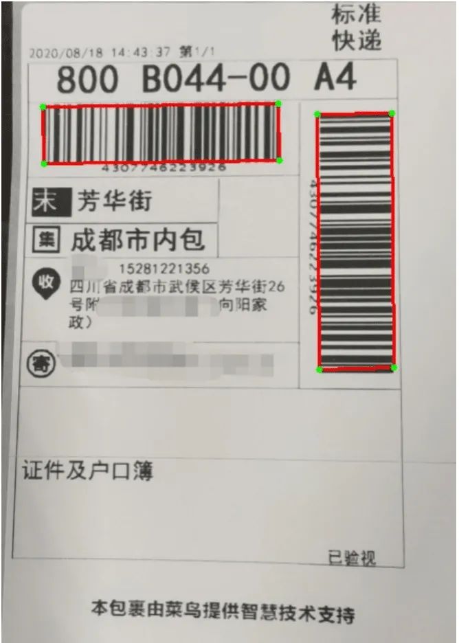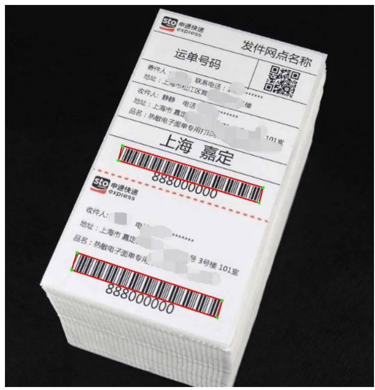 起初在github上看到一个使用DBNet检测条形码的程序,不过它是基于pytorch框架做的。于是我编写一套程序把pytorch模型转换到onnx文件,使用opencv读取onnx文件做前向计算。编写完程序后在运行时没有出错,但是最后输出的结果跟调用pytorch 的输出结果不一致,并且从可视化结果看,没有检测出图片中的条形码。这时在看到网上有很多使用onnxruntime部署onnx模型的文章,于是决定使用onnxruntime部署,编写完程序后运行,选取几张快递单图片测试,结果如下图所示DBNet检测到的4个点,图中绿色的点,红色的线是把4个连接起来的直线。