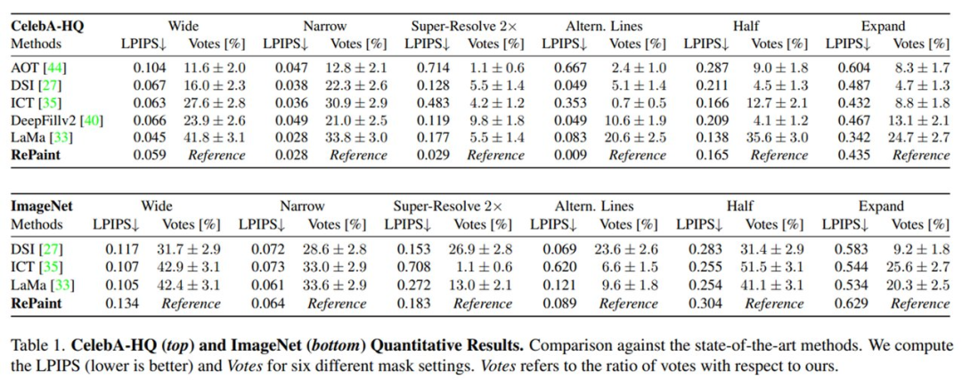 宽和窄蒙版(Wide and Narrow masks):为了在标准图像修复场景中验证 RePaint,该研究使用 LaMa 设置宽和窄蒙版。在 CelebA-HQ 和 ImageNet 中,对于 Wide 和 Narrow 设置,RePaint 以 95% 的显着性裕度(margin)优于所有其他方法。