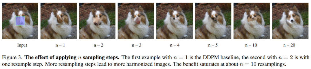 当直接应用上述方法时,研究者观察到:只有内容类型(content type)与已知区域匹配。比如,在下图 3 中,当 n 为 1 时,图像修复的区域是与原始输入图像狗狗的皮毛相匹配的皮毛纹理。尽管图像修复的区域与邻近区域的纹理相匹配,但在语义上显然是不正确的。因此,虽然 DDPM 利用了已知区域的上下文,但它并没有很好地协调图像的其他部分。