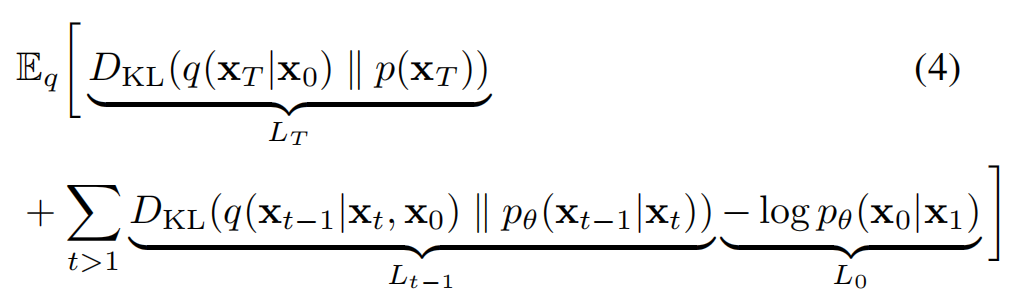 根据 Jonathan Ho 等人在论文《Denoising Diffusion Probabilistic Models》中的扩展,损失(loss)可以进一步分解为如下公式 (4) 所示: