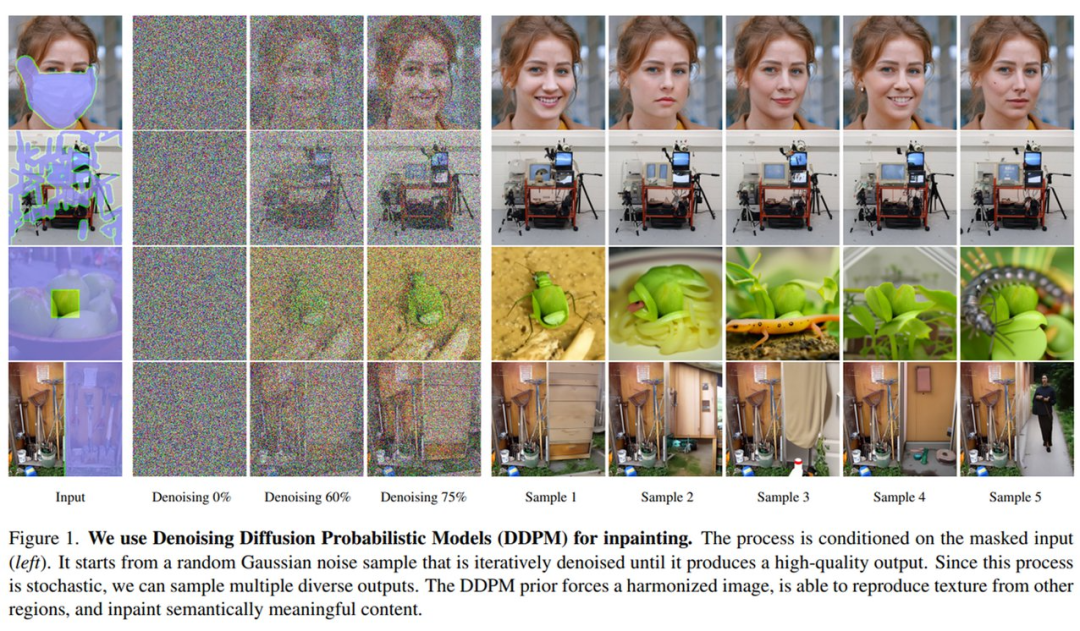 它的修复效果是这样的,RePaint 使用扩散模型填充缺失的图像部分:下面示例中,蓝色部分是图像缺失部分,也就是需要 RePaint 修复的部分,RePaint 会根据已知的部分生成缺失的部分。它的修复过程是这样的:首先从纯粹的噪音开始,然后对图像逐级降噪,中间的每一步使用图像已知部分来填充未知部分。