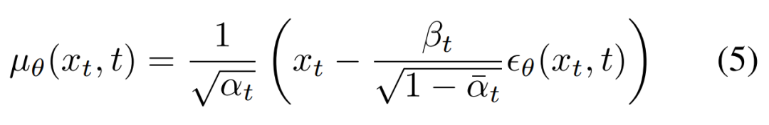 在 Jonathan Ho 等人的这篇论文中,他们认为参数化模型的最佳方法是对添加到当前中间图像 x_t 的累积噪声ϵ_0 预测。如下公式 (5) 所示,研究者对预测的平均值 µ_θ(x_t, t)进行参数化表示。
