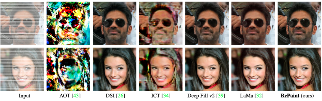 RePaint 在极端情况下修复质量也比较好:输入图像的每隔一行(例如只留下高度和宽度维度上 stride= 2 的像素)都是未知的,大多数修复方法都失败了,但是 RePaint 可以很好的进行修复: