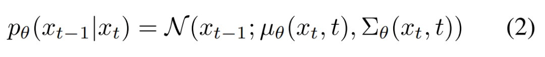 训练 DDPM 以反转公式 (1) 中的过程。反转过程通过一个「预测高斯分布参数 µ_θ(x_t, t)和Σ_θ(x_t, t)」的神经网络进行建模。具体如下公式 (2) 所示: