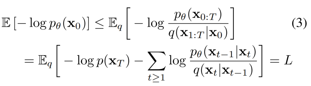 公式 (2) 中模型的学习目标通过变分下界(variational lower bound)得到,具体如下公式 (3) 所示: