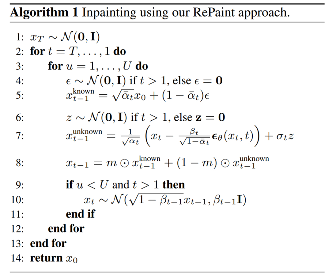 如下为使用 RePaint 方法进行图像修复的算法 1: