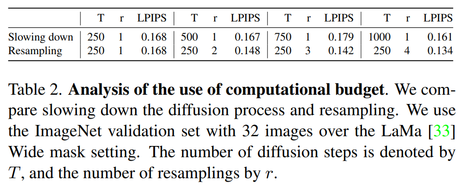 为了分析增加的计算预算是否会提高重采样性能,该研究将其与第 4.2 节中描述的缓慢扩散过程中常用技术进行了比较。图 6 和表 2 中展示了对每个设置使用相同计算预算的重采样和缓慢扩散。该研究观察到重采样使用额外的计算预算来协调图像,而在缓慢扩散过程方面没有明显的改进。