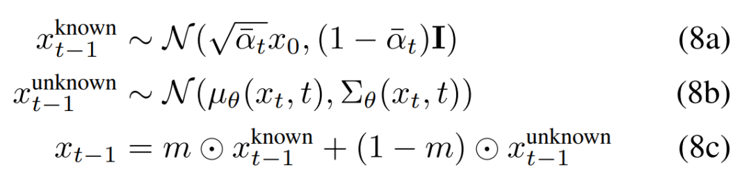 由于前向过程通过添加的高斯噪声的马尔可夫链(Markov Chain)来定义,研究者可通过定义 (7) 在任意点上采样中间图像 x_t。这使得他们在任意时间步 t 采样已知区域 m⊙x_t。因此,通过公式 (2) 处理未知区域和公式 (7) 处理已知区域,研究者得到了如下所示的反转步(reverse step)的表达式。