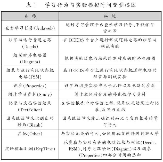 原始数据集定义并记录了不同学时和不同学习任务下的15种大类的学习活动。例如,“Deeds_Es_#_#”表示某一课时进行某一任务的普通逻辑电路模拟活动;“Deeds_Es”表示未具体甄别出所属课时以及所属任务的普通逻辑电路模拟活动。需要说明的是,“Deeds_Es_#_#”和“Deeds_Es”虽然在数据采集中被认为是两种学习活动,但它们之间的差异仅在于具体课时和任务的不同,本质上都是在进行逻辑电路模拟活动。因此,本研究对类似的学习活动进行了合并处理,将其归纳为>种学习行为。另外,为了探究学习者之间在实验模拟时间(不包括在实践操作之外的学习任务查看、学习任务提交等活动投入时间)上的差异,将学习者在虚拟仿真实验平台上的学习时间也纳入考虑。最终,本研究选择了如表1所示的10个变量,并在表中对各变量进行了描述与说明。