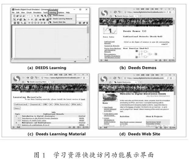 本研究数据来源于意大利热那亚大学(University of Genoa)2014年秋季学期计算机工程专业115名学生在“数字电路”实验课程中的学习过程数据[21]。课程基于数字电路教育与设计组件(Digital Electronic Education and Design Suite,DEEDS)[22]虚拟仿真实验平台开展。在国内,电子技术类实验课程的教学主要基于计算机仿真软件进行。该类软件在教学中,一方面只适用于原理性验证,如Matlab、Psim等;另一方面在进行实验模拟时,需要掌握较多关于平台(如Pspice、Saber等)的基础知识,对于初学者来说存在较大困难[23]。与之相比,DEEDS平台不仅通过简单易学的平台操作,满足教师教学以及学生实践探究的需要,还通过在菜单栏增添“Learning”选项实现课程相关学习资源的快捷访问功能[24],如图1(a)所示。传递的资源主要包括平台使用示例(Deeds Demos)、课程学习任务(Deeds Learning Material)以及平台介绍(Deeds Web Site),详见图1子图(b)(c)(d)。建构主义学习理论认为,学习是学习者在一定的教学情境下,借助其他辅助手段,利用必要的学习材料和学习资源,通过意义建构的方式获得的。DEEDS不仅为学习者提供了相应的建构环境,还为学习者提供了必要的学习材料和资源。因此,本研究选择该平台进行实践课程学习行为探究,在一定程度上更能反映学习者自主建构知识的过程。