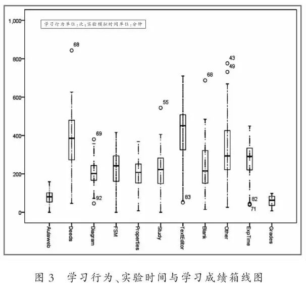 班级学生学习行为、实验模拟时间以及学习成绩分布的箱线图,如图3所示。
