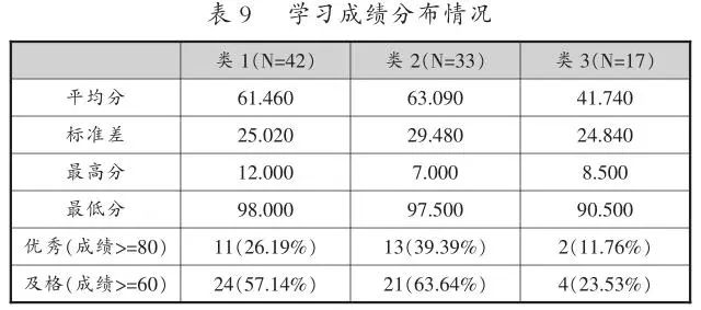 为进一步分析不同学习模式群体在学习效果上的差异,本研究对群体学习成绩进行了两两比较,结果(见表8)显示,类3与类1、类2均存在着显著差异,类1与类2在学习效果上不存在显著差异。各类学习成绩分布情况如表9所示,其中优秀行表征各类群体中成绩在80分以及上的人数;及格行表征考试成绩在60分及以上的人数。虽然类1与类2学习成绩虽在总体水平上不存在显著差异,但是类2代表的学习行为模式群体的学习成绩优秀率和及格率明显高于类1(见表9),这表明在课程学习中,类2代表的学习行为模式更为可取。