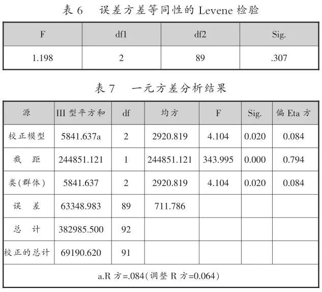 研究采用一元方差分析,以学习效果作为因变量,以聚类结果作为自变量,探究学习行为模式与学习效果之间的关联。误差方差等同性的Levene检验结果,如表6所示,F=1.198,,满足方差分析的条件,故而可进行一元方差分析。一元方差分析结果(F=4.104,