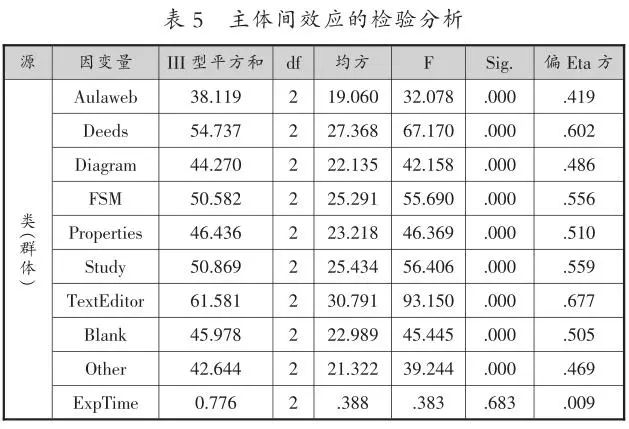 =67.7%)这两种行为。在实验模拟时间(ExpTime)上,类间不存在显著差异。进一步对群体在各变量上进行两两比较,结果发现:9种学习行为在三类学习群体间均存在显著差异