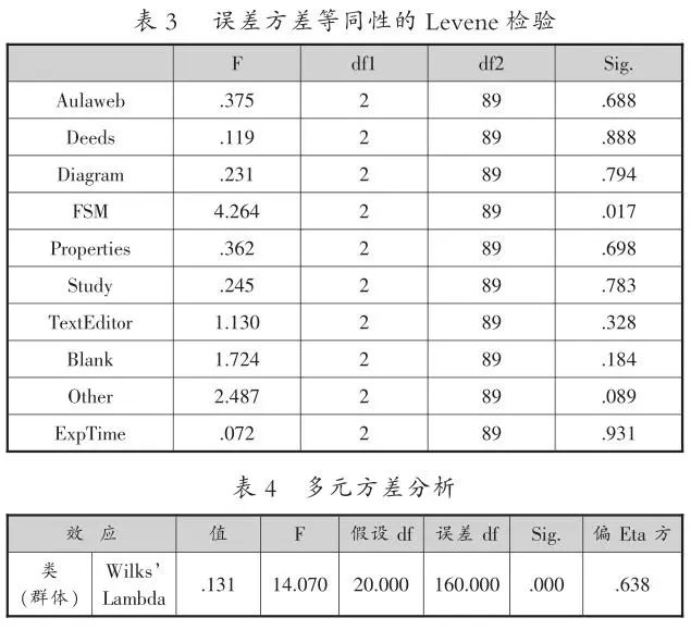 然后,进一步使用多元方差分析方法(也称多变量方差分析),探究群体在各行为变量上的差异。群体间在各变量差异上探索的过程,实质上就是将各行为变量看作因变量,分组结果作为自变量。多元方差分析可以同时研究多个因变量之间是否存在显著性差异,避免了单因变量方差分析检验效率低、忽略变量间相关关系等缺点[26],该方法已在教育研究中得到了有效应用[27-28]。