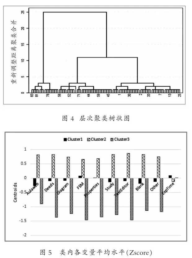 另一部分研究根据学习者在某些方面呈现出来的特征,首先对学习者进行群体划分,继而再比较不同学习群体学习行为模式之间的差异。例如,Kinnebrew等[12]根据学习成就对学习者进行群体划分,并采用数据挖掘方法,对不同学习成就群体在元认知方面的学习行为模式进行了评价与比较;Hou[13]按照性别对学生进行群体划分,并探究了学习者在角色扮演游戏中学习行为模式的差异;Yang等[14]对不同学习小组在协同创作环境下的学习行为转换模式进行了探索,并根据得到的学习行为模式提出了后续教学活动的改进意见;He[15]对视频直播课程环境下学习者在课程参与方面和交互方面的学习行为模式进行了探索,研究发现,工程和科学专业的学生无论是在师生互动还是在生生互动方面都明显低于教育学和医学专业的学生。然而,更多研究根据学习者在学习过程中表现出的学习行为,采用数据挖掘中的聚类方法对学习者进行群体划分,继而比较不同群体在学习行为模式上的差异。例如,Cerezo等[16]根据学习管理系统记录的学习者作业投入时间、努力程度和作业提交是否延迟等行为,对学习者进行群体划分,研究发现,根据这些行为可以将学习者划分为四种不同的学习模式群体,且不同群体在学习效果上也存在着差异;Lust等[17]对在线课程中学习者学习工具使用的行为模式进行了类似研究;李爽等[18]根据学习行为序列特征探索了学习者的在线课程参与情况,结果表明,根据学习者的行为转换序列,可以定义出“低投入式”、“浅层次投入式”、“绩效投入式”、“循序渐进式”、“随机参与式”等五种不同的在线学习行为参与模式。这些发现,对分析在线学习参与模式、课程建设方面都具有重要的参考价值。