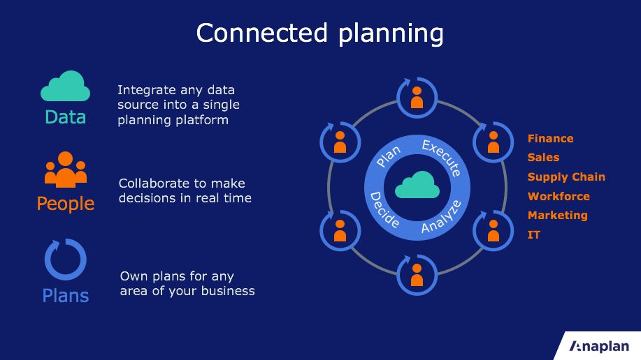 Anaplan 的业务主要面对商业客户。通过专利内存计算引擎(Hyperblock)架构多租户数据架构 SaaS平台,产品可实现动态协作和智能规划;通过连接人员、数据管理、项目规划、实时规划决策,最终提高商业效率。Anaplan 另外一个巨大优点是它的服务完全基于“云”,并且支持“零部署” ,用户们可以在智能设备上登录平台Anaplan就可以连接服务。