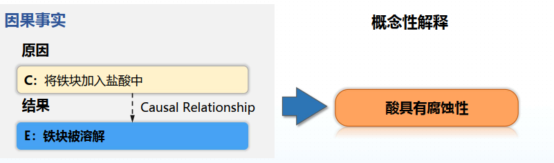 例如将铁块加入盐酸中,导致铁块被溶解。需要生成概念性的解释酸具有腐蚀性,显然这不只是因果对的解释。