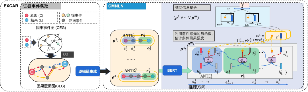 具体而言是使用条件马尔可夫神经逻辑网络(CMNLN),其中逻辑网络具有较强的可解释性与可靠性。神经逻辑网络是指利用神经网络表示规则,并赋予每个因果规则以权重(因果强度),以应对规则集合中可能存在的噪音与统计关系的复杂性。条件马尔可夫还能支持因果叠加效应,即对于同一规则,不同的前件可能对因果强度带来不同的影响。基本逻辑是:证据事件→逻辑规则→因果逻辑图。