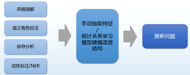 传统的NLP任务从语料中提取特征,利用统计关系学习建模语义结构,属于符号系统处理方法。给定若干个任务,例如共旨消解、语义角色标注、依存分析或者NER等等任务,传统方法是手工提取一些特征,然后把特征输入到一些统计模型当中,然后得出分类结果、预测结果。