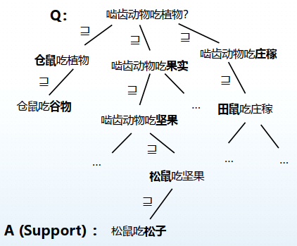 推理中的换词对NLP中的多项选择问答任务非常有必要。例如上图中的任务形式:给定问题:啮齿动物吃植物?知识库当中有一条知识是:松鼠吃松子。