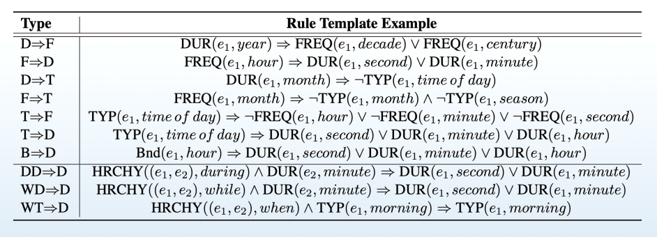 如何利用逻辑规则,约束神经模型?上图是事件时间常识知识预测任务,其中预测为对应的时间单元:给定事件起床,推测频率、持续时间以及典型发生时间。
