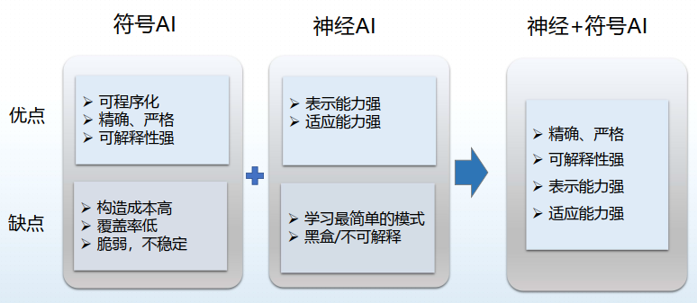 神经方法和符号方法各有哪些优缺点?符号AI对于规则、知识,能够可程序化,可以用编程的方式直接把规则编写到程序当中,然后可以进行精确、严格的匹配、推理,得到的结果也是符合规则的,因此解释性强。缺点是构造成本太高,覆盖率低,稳定性也不太够。