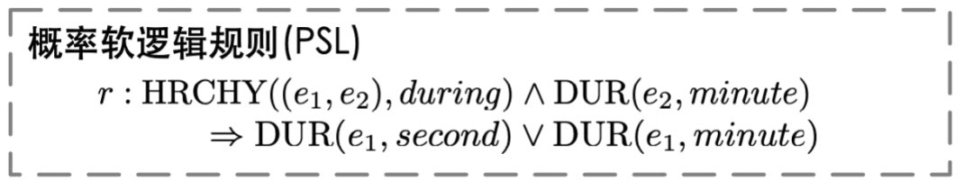 此规则怎样利用?我们设计了基于软逻辑规则的时间的常识预测。给定输入:我是在妈妈<e2>准备早餐</e2>期间<e1>起床</e1>的,得到原子式:<HRCHY((e1,e2),during>,然后将原子式概括成概率软逻辑规则,如下图。