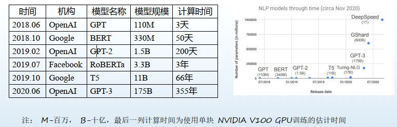 实际上,在自然语言处理(NLP)领域,预训练模型规模以每年约10倍的速度增长, 模型的通用智能水平显著增强。如上图,无论是计算的复杂度、参数以及训练时间,随着时间的推移,都有跨越性的发展,也促使模型性能大幅度提升。