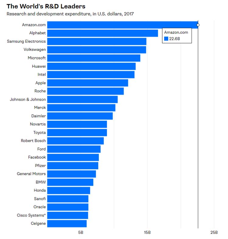 四月初,彭博社发布了 2017 年全球企业研发投入的排行榜,亚马逊以 226 亿美元的巨额投入高居榜首,比第二名 Alphabet 高出了整整 60 亿美元,这一数据比 2016 年翻了一番。