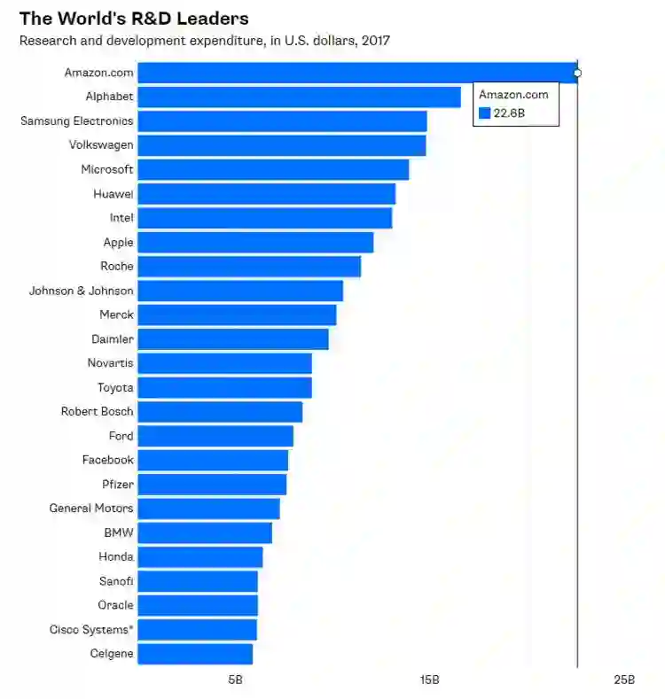 直到 2013 年,全球企业研发排行榜里都找不到亚马逊的身影,但这家以电商业务闻名的公司却在近几年持续霸榜,甚至遥遥拉开了与第二名的差距。