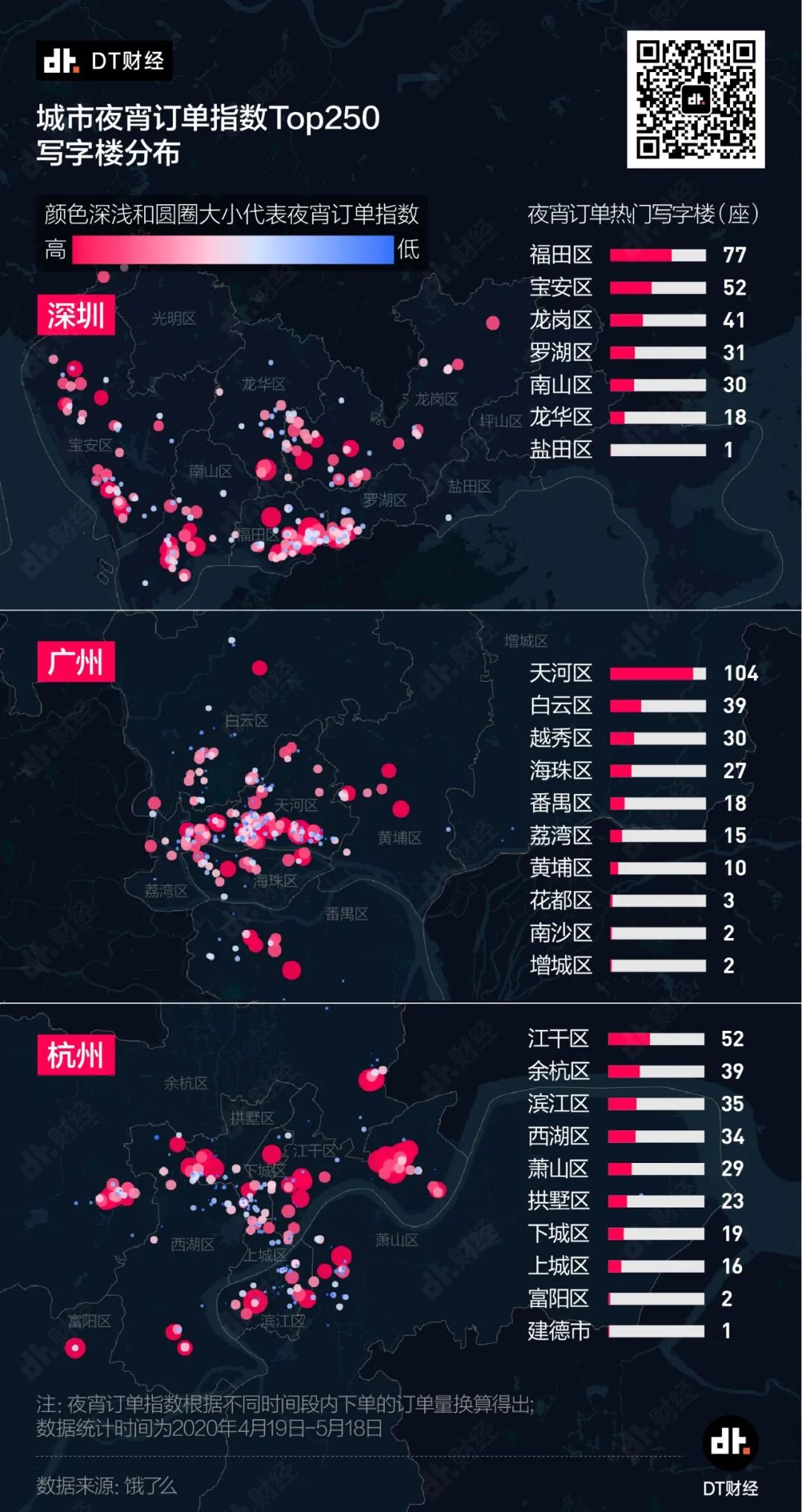以深圳、广州和杭州三个奋斗不夜城为代表的,让我们用数据来看看哪些区域的职场人吃着最苦的夜宵,熬着最长的夜。