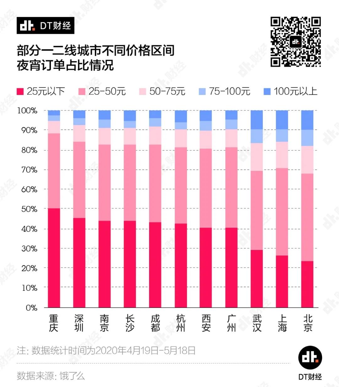 除了对夜宵的偏好度差异,不同城市的人们在夜宵上花的钱同样阶梯分明。
