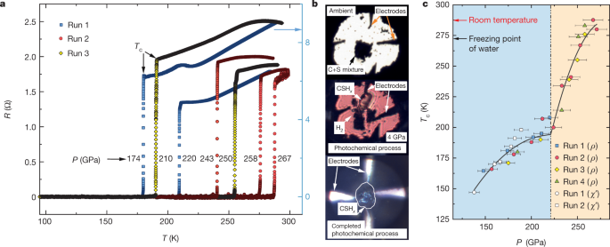光化学转化的碳硫氢(carbonaceous sulfur hydride, C-S-H)系统的超导临界温度在 267±10 GPa 下最高可以达到 287.7±1.2K(约 15℃)