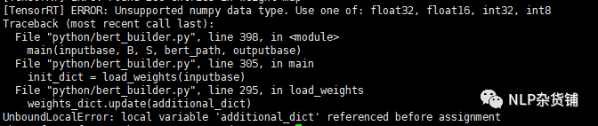 报错表示,在模型数据加载过程中,出现了不支持的数据类型,于是在bert_builder.py的252/253行加入了代码: