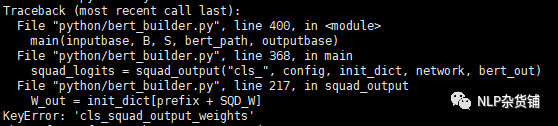 报错表示,参数中没有一个叫"clssquadoutput_weights"的,demo是squad的一个样例,而我的是二分类下游任务,最后输出层参数名称不一致,根据上面打印的参数名字(不同的下游任务或者训练代码,最后层的参数名字都可能不同),将217/218行代码修改为: