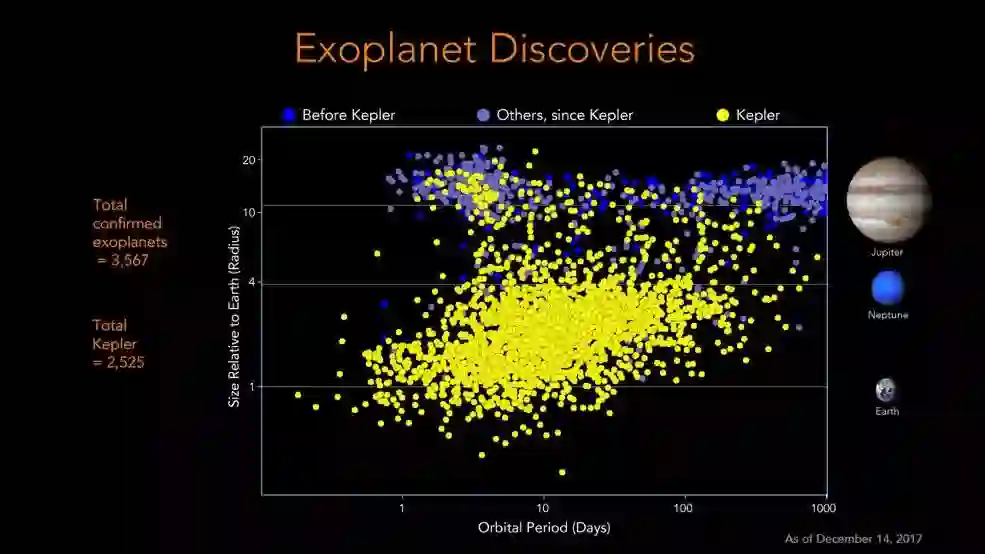 图丨直到今日,我们已经确认了超过 3500 个系外行星,其中超过 2500 个行星是在参照开普勒望远镜数据的情况下发现的。这些行星的大小介于地球和木星之间。多亏了开普勒望远镜,在短短的几十年里,人类发现了更多的系外行星。