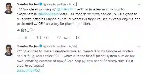 除此以外,此次新发现还有一个最大的亮点,那就是这次的研究成果是与 Google 一起合作完成的。NASA 的科学家使用 Google 机器学习来对开普勒数据进行分析,其效率和准确性远超传统的分析方法。据此,NASA 认为 Google 的 AI 技术将有助于在太阳系外探测到外星生命的迹象。