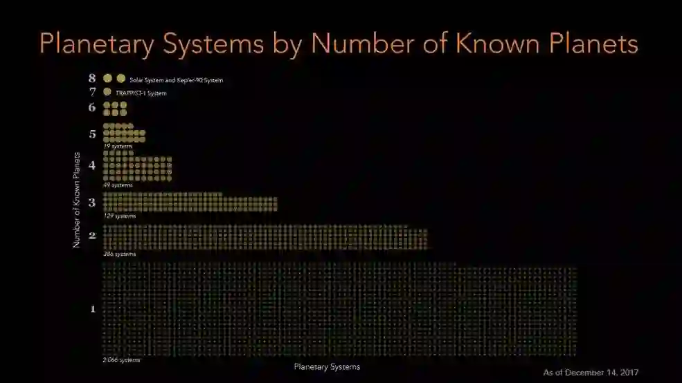 图丨图中的每一个点代表一个已经发现的星系,而数字代表该星系中所拥有的行星数量,从图中我们可以发现,在已知的 2000 多个星系(至少有一颗行星)中,行星越多的星系越稀缺。而此次两颗行星的发现则意味着有可能有带有更多行星的星系尚待发现。