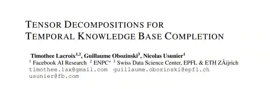 关系数据中的表示学习和链接预测算法大多是针对静态数据设计的。然而,它们所应用的数据通常会随着时间的推移而变化,比如社交网络中的朋友图,或者推荐系统中的用户与条目的交互。这也是知识库的情况,其中包含的事实,如(美国,有总统,B.奥巴马,[2009-2017]),只是在特定的时间点有效。对于时间约束下的链路预测问题,即,回答诸如(US, has president, ?, 2012)之类的问题时,我们提出了一个受4阶张量的正则分解启发的解决方案。我们引入了新的正则化方案,并提出了一个复杂的扩展(Trouillon et al., 2016),实现了最先进的性能。此外,我们还提出了一个新的Wikidata构建的知识库完成数据集,比以前的基准要大一个数量级,作为评估时间和非时间链接预测方法的新参考。