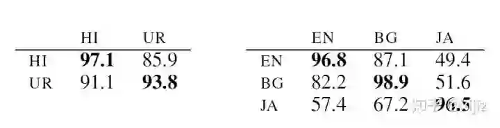如图3-1所示,该图是NER和POS的跨语言迁移学习实验结果,我们可以看到在相似的语言上进行迁移学习会比较好。最极端的例子就是微调和评估都使用一种语言,这种效果是最好的,所以我们可以看到图表中最好的分数都在对角线上。